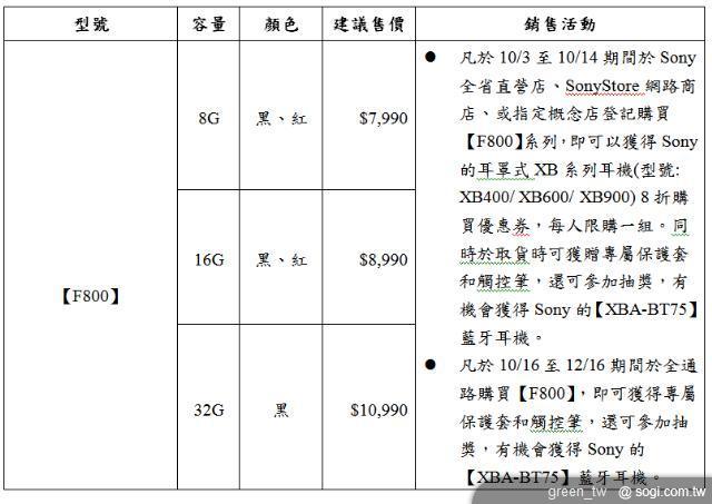 全新的 Walkman【F800】系列數位多媒體播放器將於 10 月 16 日在台上市,「陳柏霖 X Walkman 熱血音樂微電影(我在 音樂在)篇」也將同步於 YouTube 網站首播,產品價格及銷售活動等請參考下表。歡迎消費者前往 Sony 台北 101 直營店、台北復興直營店、台中直營店、高雄直營店、Sony 官方購物網站【http://www.sony.com.tw/store/】、Sony 客服中心 (電話:4499111) 以及各大消費性電子產品通路選購。