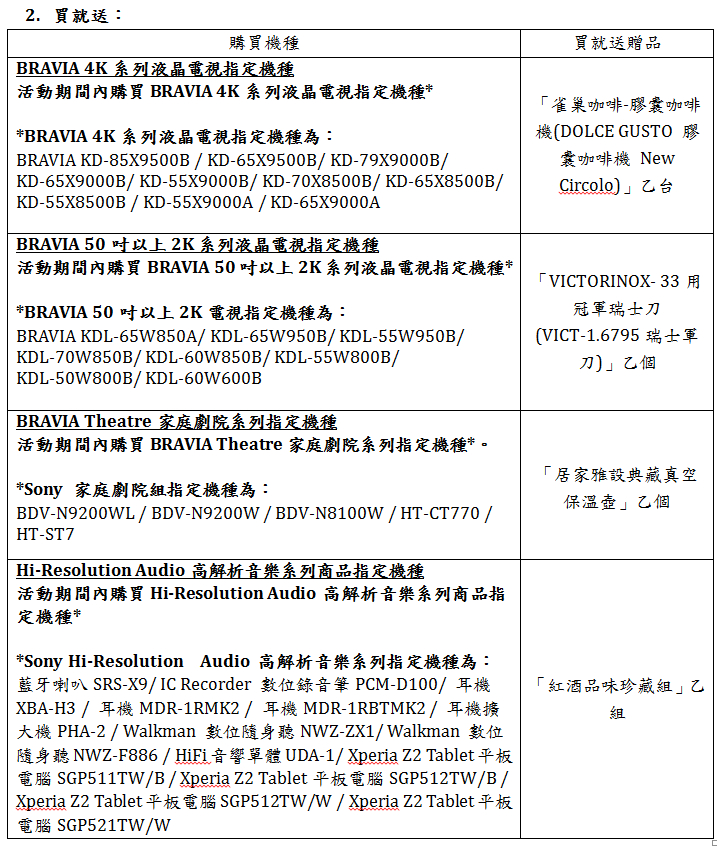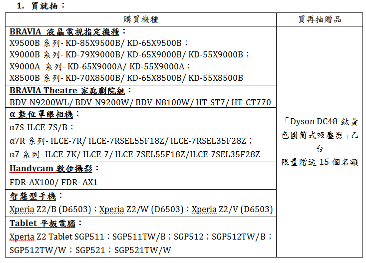 Sony 夏季尊榮獻禮活動推出各項限時優惠,凡於活動期間購買 BRAVIA 液晶電視可抽限量商品外,現在購買 BRAVIA 家庭劇院組與 Soundbar、世界體積最小微單眼「α7s」與α數位單眼相機指定相機、Handycam 數位攝影機、智慧型手機 Xperia 系列,以及 Tablet 平板電腦系列中的指定商品,皆有機會抽中市價 25,500 元的「Dyson 圓筒式吸塵器。購買 Sony 電視、家庭劇院、相機與數位攝影機等指定商品即可獲得「雀巢咖啡 - 膠囊咖啡機」與「居家雅設典藏真空保溫壺」等多項好禮。數量有限,送完為止!詳細活動訊息請洽活動官網:http://event.sony.com.tw/2014_Summer_SP/。