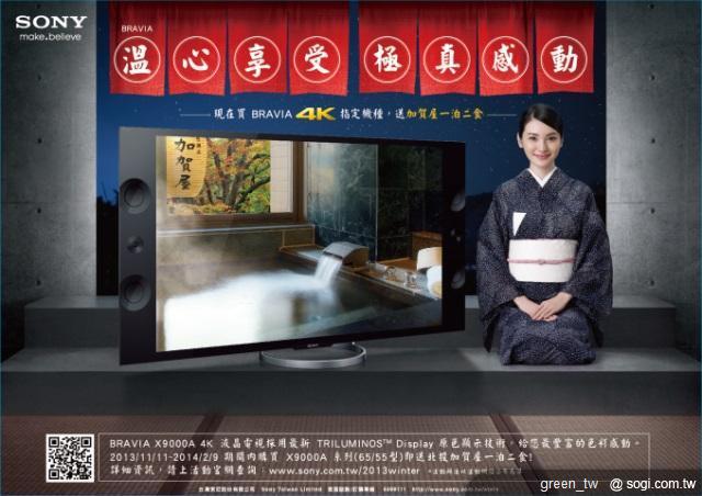 即日起至 2014 年 2 月 9 日,Sony 推出歲末電視好康大放送,特別針對 BRAVIA 4K 液晶電視加碼贈送北投加賀屋溫泉住宿卷,讓消費者除了享受 BRAVIA 4K 液晶電視帶來的極致影音體驗,也能同時安排一趟放鬆身心的精緻旅行,迎接美好新年!另外購買指定款 BRAVIA 液晶電視,即贈送年度人氣商品 BRAVIA Google 雲端媒體播放器、Sony 玩咖旅行袋或精選藍光片組合等精美好禮,現在就是升級家庭影音娛樂設備的最佳時機!