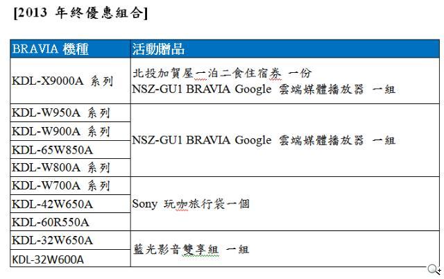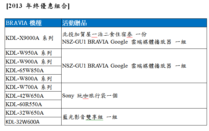 此次電視年度優惠活動,全面涵蓋自 32 吋入門款電視至 65 吋頂級 4K 電視等各種選購需求。指定款機種贈送獨家 Sony 玩咖旅行袋或精選藍光影片,最受矚目的搭贈組合是甫上市的話題性商品 BRAVIA Google 雲端媒體播放器(市價:NT 4,990),讓 Sony 電視的愛用者,除了享受 BRAVIA 液晶電視高畫質及高音質的影音震撼,同時能輕鬆悠遊於 Google TV 所提供的各項雲端服務,下載體驗 Android 應用程式,並以高度整合的操作介面及輸入方式,樂享 Sony 電視帶來更聰明的網路娛樂生活。