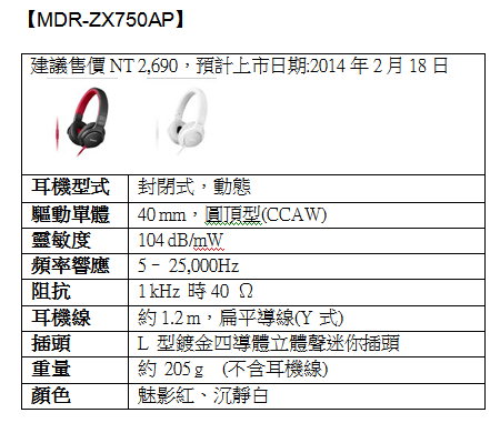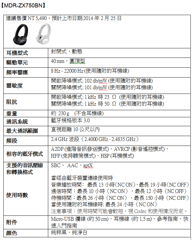 主打款 MDR-ZX750BN 是 Sony 首款結合無線藍牙與 AI 人工智慧降噪功能的耳罩式耳機,能透過 apt-X 高音質傳輸技術提供如水晶般的無線音樂品質,並且主動分析使用者身處的背景聲音成分,進而大幅降低周圍噪音,創造寧靜無干擾的行動聆聽環境,最適合通勤、旅行時配戴。內建的 NFC 快速連線功能,輕鬆配對智慧型手機、平板電腦、音樂播放器等行動裝置,一觸即享美好音樂。