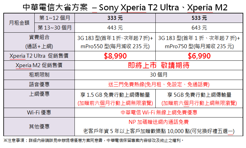 中華電信獨賣 Xperia T2 Ultra 及 Xperia M2 4G 手機搭配大省方案輕鬆帶回家