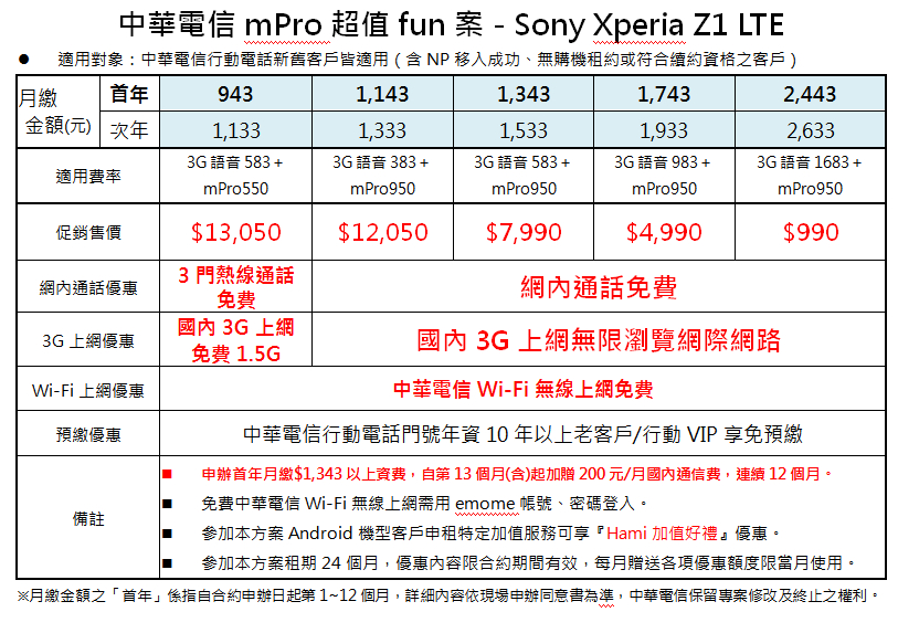 Xperia Z1 4G LTE 版搭配中華電信超值 fun 案,首年月繳 NT1,343,手機獨賣只要 NT7,990