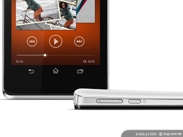 ▲Sony Xperia V LT25i 螢幕下方內由左至右依次設置:「返回鍵」、「主頁鍵」、「多工處理鍵」;機身右側邊緣設置「音量控制鍵」與「開關啟動按鍵」。