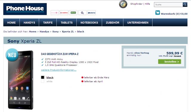 ▲德國線上商城 PhoneHouse.de 近日已經釋出 Sony Xperia ZL 的預購介面,空機售價為 599.99 歐元(折合約新台幣 23,131 元),提供黑、白兩種顏色款式,預計四月正式出貨。(圖片來源:Xperia blog)
