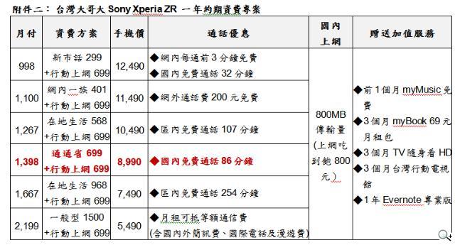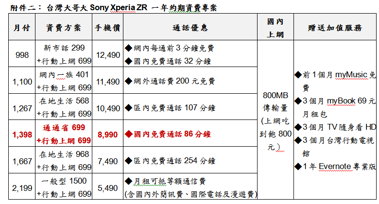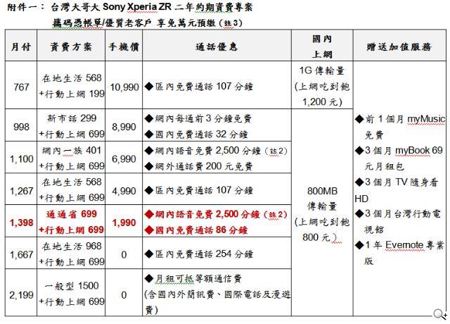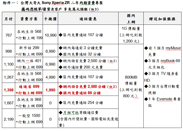 - 月付 1,398 元(二年期專案),即可以 1,990 元擁有 Xperia ZR,並享網內語音免費 2,500 分鐘、國內免費通話費 86 分鐘,再提供 myMusic 前 1 個月免費,贈送 3 個月 myBook 69 元月租包、3 個月 TV 隨身看 HD、3 個月台灣行動電視館、1 年 Evernote 專業版等加值好康服務。(詳細資費方案參閱附件資費內容)
