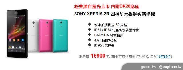 Xperia ZR 擁有巧克黑、糖瓷白、果漾紅、薄荷綠四色,巧克黑、糖瓷白兩款即將上市,果漾紅、薄荷綠兩款將於近期上市,單機建議售價為 NT$16,900 元。