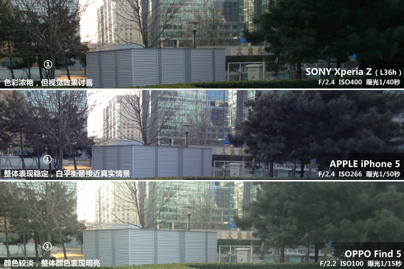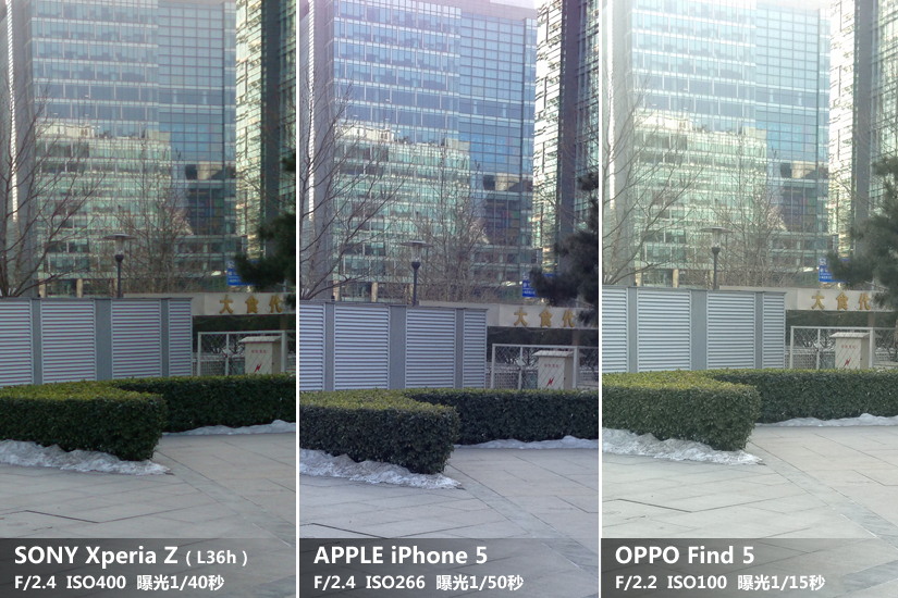 ▲在光圈與感光度接近的情況下,Sony Xperia Z L36h 與 Apple iPhone 5 所拍攝的圖片亮度與色彩飽和度較接近,而 OPPO Find 5 圖片曝光過度,色溫偏冷,存在色彩失真的情況,當然 OPPO Find 5 曝光定在 1/15 秒對成像品質產生了一定的影響,下面圖片也因此設定造成一定影響。