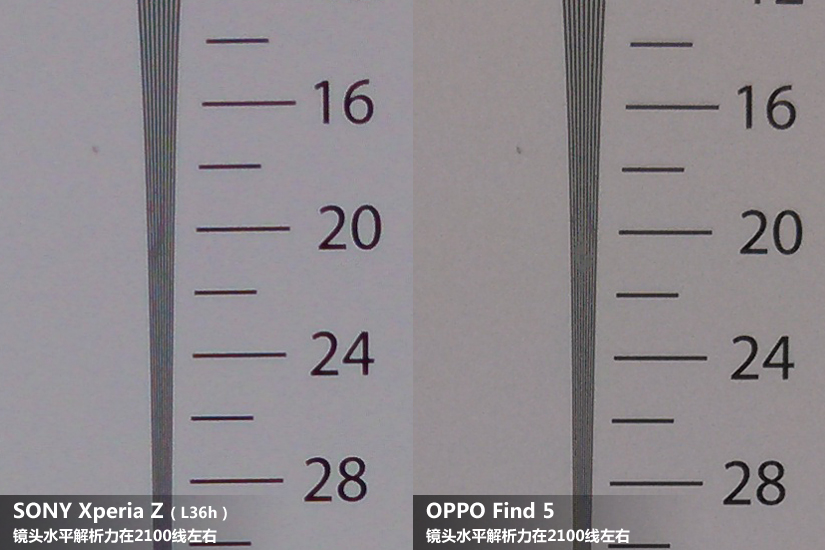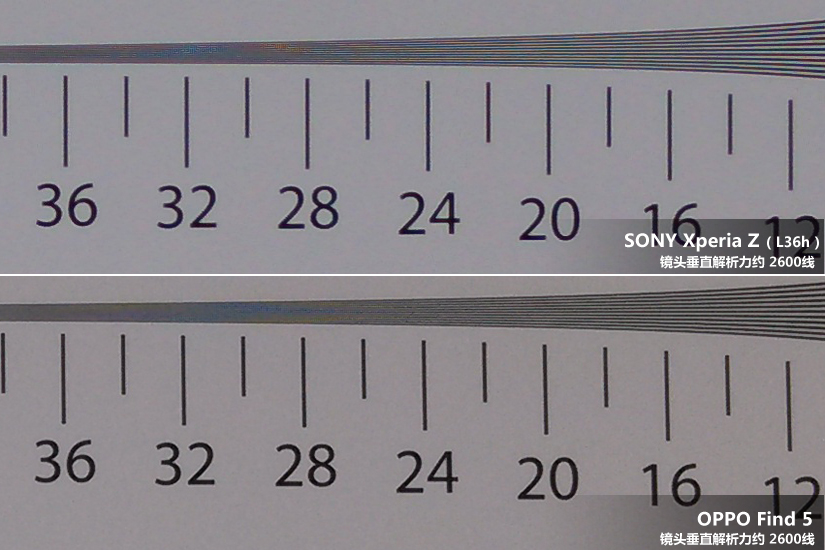 ▲從鏡頭垂直解析力的比對情況來看,Sony Xperia Z L36h 與 OPPO Find 5 皆約為 2,600 線,數據上相差不大。