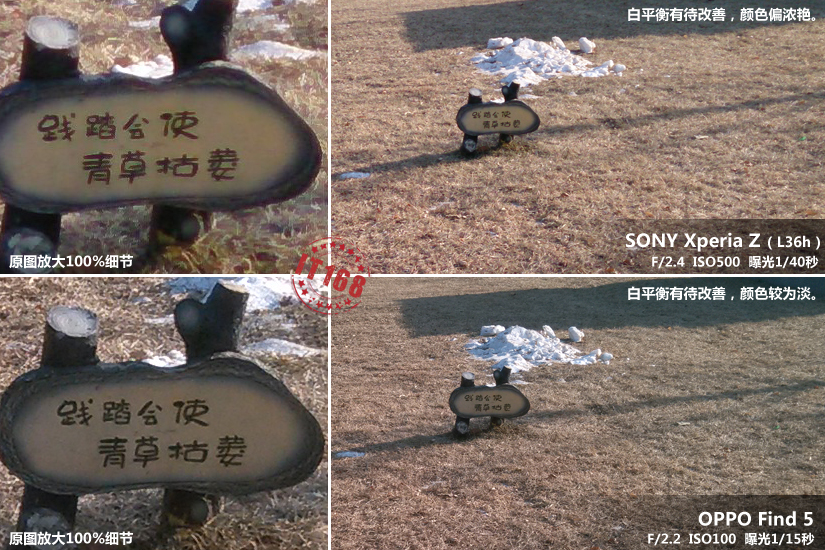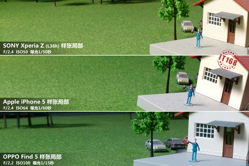 IT 168 的觀點:儘管 Sony Xperia Z L36h 和 OPPO Find 5 都使用了 1,300 萬堆疊式鏡頭,但二者在拍照上卻依舊有異同之處,Sony Xperia Z L36h 在整體成像上佔據優勢,而 OPPO Find 5 則在細節上似乎領先一步,二者間並沒有相互壓倒性的勝利。另外不難看出,Sony Xperia Z L36h 和 OPPO Find 5 的差距更多表現在二者軟體層次,包括成像分析,軟體演算法等等,在硬體上幾乎可以說差距不大。而在與 Apple iPhone 5 的對比中也著實看到 1,300 萬畫素在拍照上的優勢,堆疊式鏡頭表現確實可圈可點。所使用的 Sony Xperia Z L36h 和 OPPO Find 5 兩款手機並非最終零售版,成像上難免有所不足,相信後續成品會有更大的提升空間。