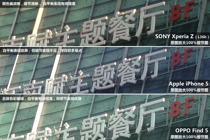 ▲日景圖片,當將原圖放大 100% 之後,查看細節圖:Sony Xperia Z L36h 顏色偏濃豔、白平衡表現有待提升,但細節較清晰;Apple iPhone 5 白平衡表現優異,不過存在較多噪點;OPPO Find 5 色準偏差,總體畫面偏綠,不過細節表現仍可圈可點。