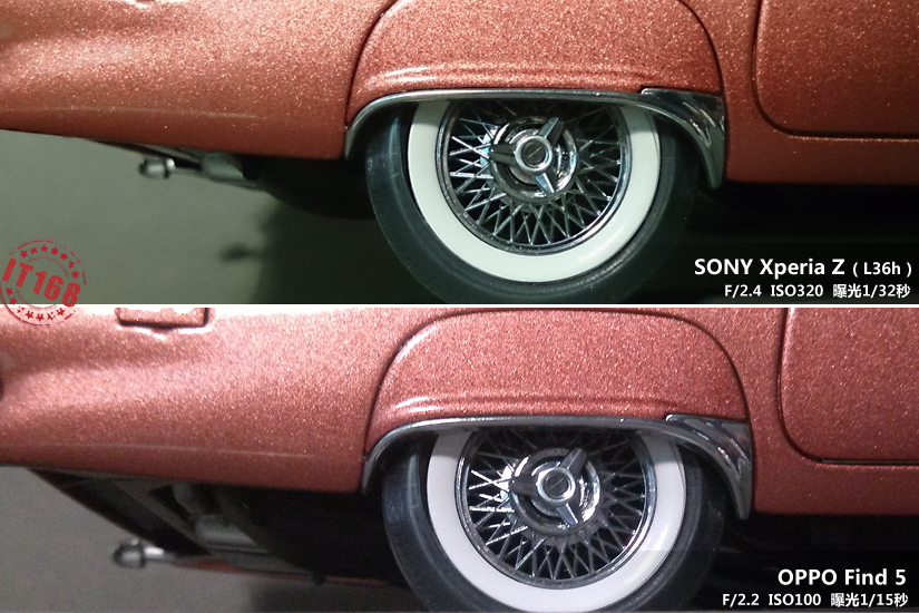 ▲但在近景特寫實際解析力測試上,Sony Xperia Z L36h 在拍攝特寫圖片時,能夠很清晰地表現玩具車車體的顆粒材質、輪胎輪廓,並且整體質感不錯,細節表現豐富,顏色表現討喜;相比之下 OPPO Find 5 立體感較弱,整體亮度較高,對比度不足。