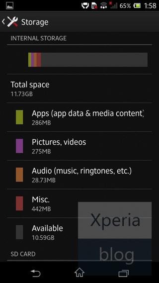 ▲Sony Xperia ZL 的 LTE 版本的型號為 C6503,針對歐洲與亞洲的 Bands 3、7、20 頻段的 LTE 網路,採用 Android 4.1.2 Jelly Bean 作業系統,內建 2GB RAM / 16GB ROM 記憶體組合,可透過儲存容量選項中查看 App、圖片、音樂、影片等容量的使用情況。(圖片來源:Xperia blog)