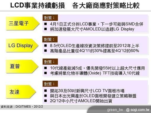 (台北訊)全球 TFT LCD 面板產業已經連續 5 季出現虧損,DIGITIMES Research 資深分析師兼副主任黃銘章分析,期間導致前 2 大廠商三星電子(Samsung Electronics)及 LG Display 分別更換相關事業部社長或公司社長;另外,在 2012 年 2 月,三星電子、夏普(Sharp)亦分別宣布重要的營運策略改變,以改善企業的獲利能力並創造新的事業商機。