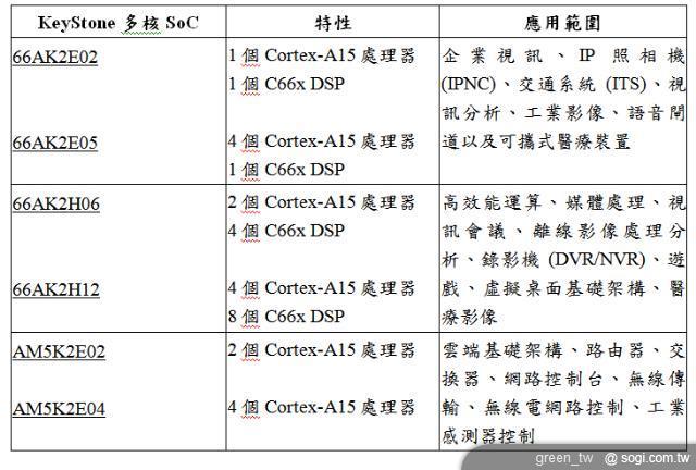 TI 最新 6 款高效能 SoC 包括 66AK2E02、66AK2E05、66AK2H06、66AK2H12、AM5K2E02 以及 AM5K2E04,皆基於 KeyStone 多核心架構之上。上述最新 TI SoC 採用 KeyStone 低延遲高頻寬多核心共用記憶體控制器(MSMC),相較其它基於 ARM 的 SoC,記憶體輸送量(throughput) 提升 50%。結合這些處理元件並整合安全處理、網路與交換技術,可降低系統成本與功耗,使開發人員實現更低成本、環保應用的開發與工作負載(workload),包括高效能運算、視訊傳送(video delivery) 與媒體影像處理等。藉由 TI 最新多核心 SoC 的完美整合,媒體影像處理應用開發人員更可創造高密度媒體解決方案。