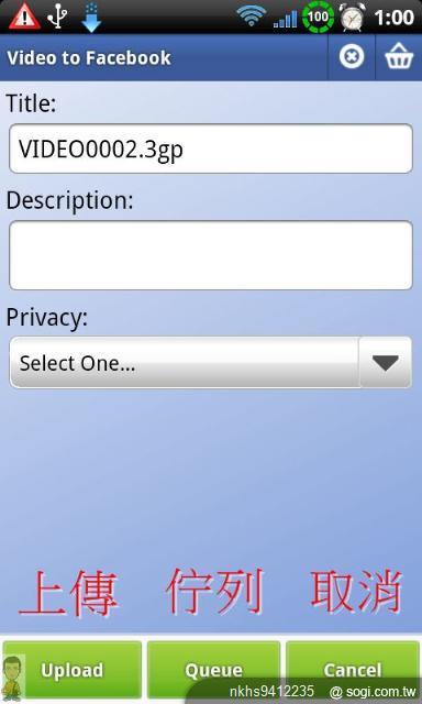 Android版的Facebook可以上傳相片,但有圖有真相的時代已經過去,影片會更真,但是Android版的Facebook卻不能上傳影片,必須將手機傳到電腦,再經由電腦上傳,但不可能隨時都有電腦在身邊,這時就可以利用這個程式,將影片傳到Facebook囉!