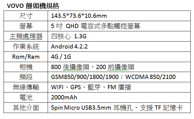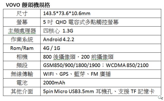 這次特別推出的 VOVO V10 饅頭機,平民化的價格以及設計有質感的外型,搭載四核心 1.3GHz 處理器、搭配 1GB RAM,採用 Android 4.2.2 作業系統,相機部份則為主 800 萬 / 副 300 萬畫素的組合,當然也支援廣受商務族群喜愛的雙卡雙待功能,在消費者好入手之下,大家也把握預購時機搶便宜搶優惠。