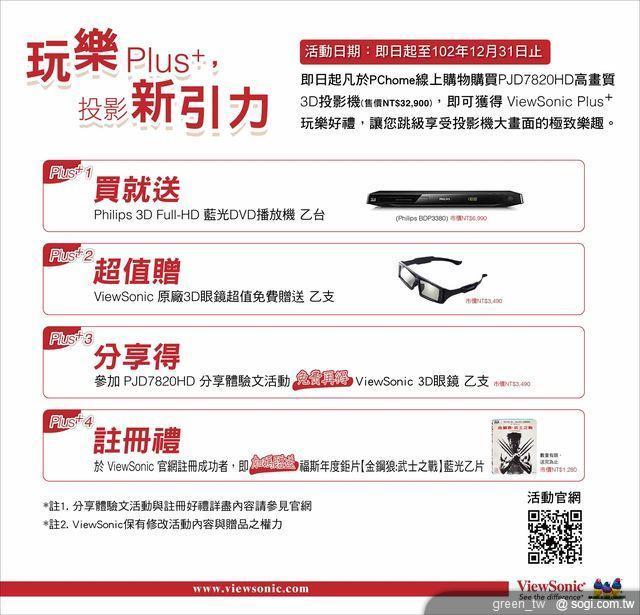 - 「Plus+3 分享得」 參加 PJD7820HD 分享體驗文活動,免費再得 ViewSonic 3D 眼鏡乙支。