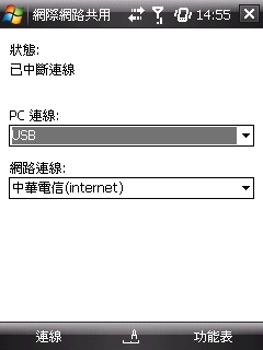 開啟「網際網路共用」程式,畫面上就會出現目前的連線狀態,以及兩個選項,「PC連線」與「網路連線」,「PC連線」指的是PDA透過何種方式跟PC連線,而「網路連線」則是PDA要用哪一個設定連上GPRS/3G網路。而左下角的「連線」按鈕,就是開始進行連線,而右下角則有藍芽設定與網路設定的功能,會直接連結到 「開始」-「設定」-「連線」 裡面的 「藍芽」設定與「連線」設定。