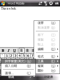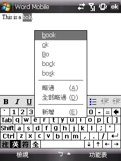 這功能僅限於檢查英文的拼字,中文字還是沒有辦法的,但是至少在PDA要編修的時候,就可以減少在Word Mobile跟字典軟體之間切換的不便。
