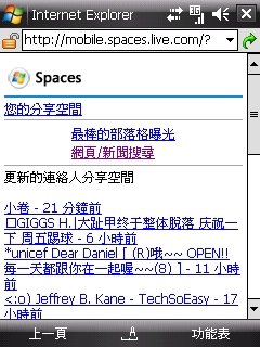 Windows Live Spaces的首頁網址是http://mobile.spaces.live.com,而個人的分享空間網址則是http://<YourID>.mobile.spaces.live.com,底下讓各位瞧瞧Windows Live Spaces的長相吧!