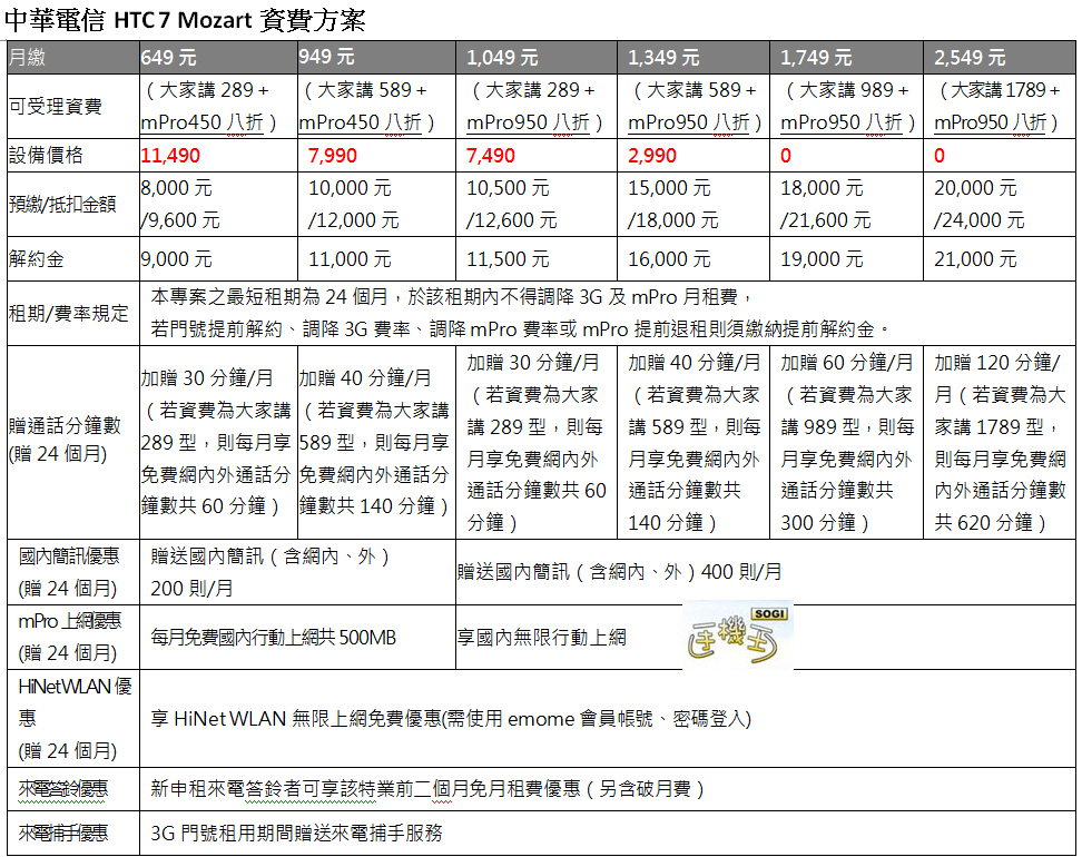 - 搭配大家講 589 與 mPro950 (租約期間月租八折),月付 1,349 元起手機只要 2,990 元,消費者可輕鬆無負擔體驗 HTC 7 Mozart 的獨家魅力。