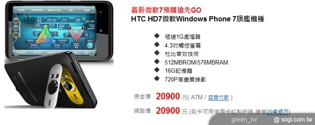 HTC HD7 單機售價為新台幣 20,900 元。(產品規格表)