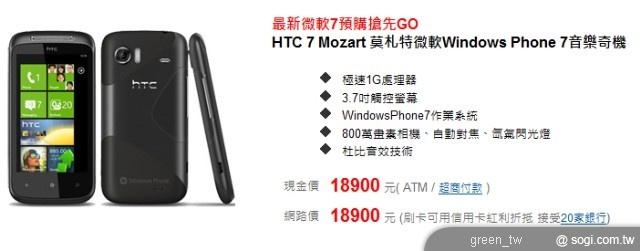 HTC 7 Mozart 單機售價為新台幣 18,900 元。(產品規格表)