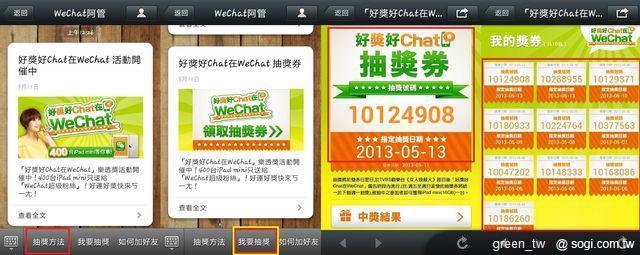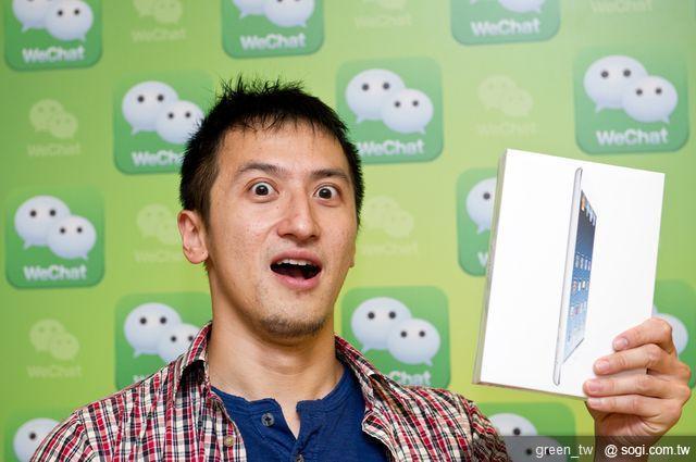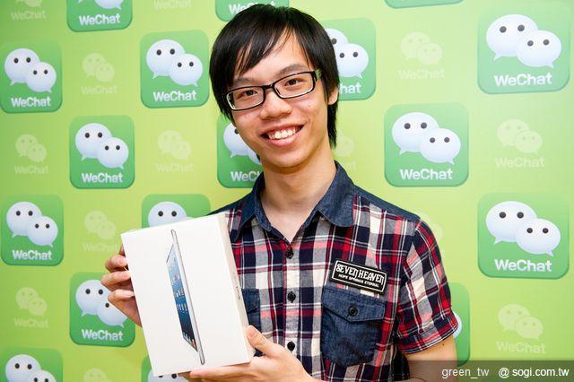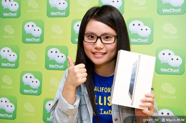 WeChat 於 5 月 2 日宣告慶祝全球同步邁入全新跨行動社群平台,並回饋台灣 WeChat 超級粉絲推出一個月送 400 台 16GB iPad mini《好獎好 Chat 在 WeChat》好運好獎抽獎活動,全台 WeChat 粉絲為之瘋狂。超簡單兩步驟,在手機中就能參加抽獎!