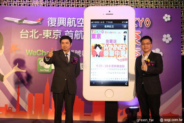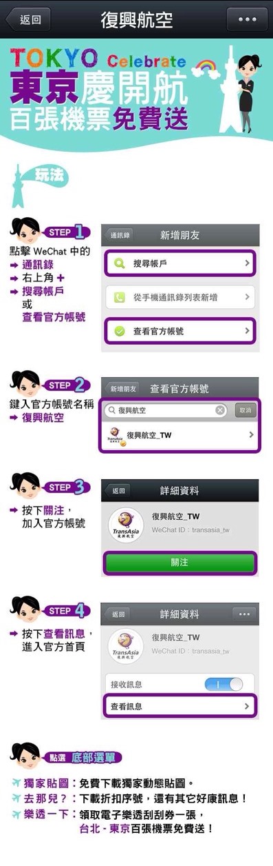 熱門跨行動通訊應用平台 WeChat,挾歐、亞、美、非等全球市場的超高人氣,在台灣繼與消費、美食、運動等知名品牌合作之後,正式宣告跨足航空領域,WeChat 攜手復興航空合作推出「復興航空 _TW」WeChat 官方帳號(WeChat ID: transasia_tw),搶先將航空相關未來應用推向智慧手持裝置;同時,今日記者會中除了拉抬 9 月 26 日正式開航的桃園 - 東京成田航線聲勢外,也發表官方帳號中獨家設計的 16 款機師空姐動態貼圖,更推出電子樂透刮刮樂抽獎活動,預計送出共計 100 張桃園 - 東京航線機票,專屬優惠、WeChat 忠實用戶獨享!