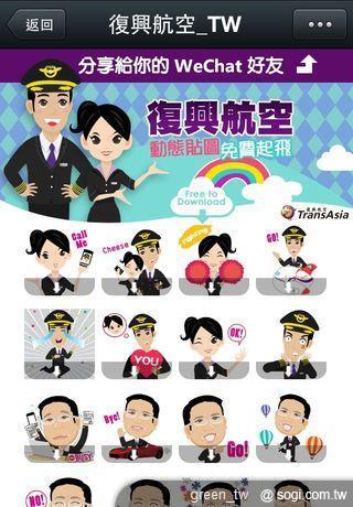 同時,即日起在 WeChat 關注復興航空官方帳號(WeChat ID: transasia_tw),還可免費下載獨家設計的 16 款動態貼圖,讓您不管在 WeChat 與好友上打招呼或打氣,都有 Q 版復興航空帥氣機師與美麗空姐陪伴;同時,亦可在官方帳號中下載折扣序號,十月底前於復興航空官網購買東京 / 大阪航線機票時,便可享有 WeChat 用戶專屬優惠折扣。