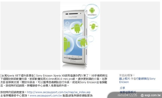 [台灣Xperia X8下週升級預告] Sony Ericsson Xperia X8使用者讓你們久等了!X8手機即將在下週開放新版軟體升級,新版軟體如同X10mini和X10 mini pro般,提供更新穎的介面、社群及影音娛樂支援,開放升級後,可以選擇透過網路自行升級,或送到Sony Ericsson全省旗艦店、掛招特約經銷商、授權維修中心由專人免費協助升級。