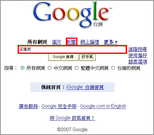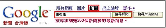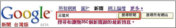 1. 開啟Google網頁,輸入你要搜尋的新聞關鍵字,例如「王建民」,點選「新聞」