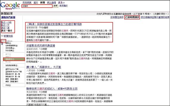 以下畫面即顯示「王建民」最近一週相關新聞搜尋結果有1278項符合。