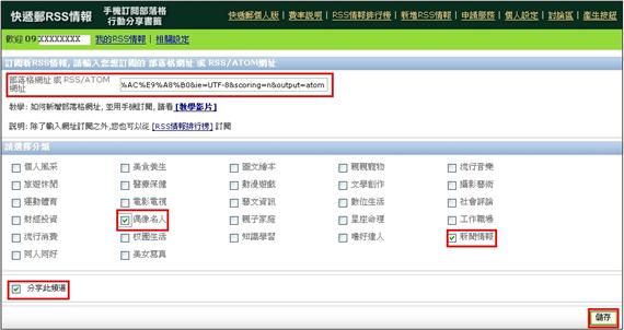 4. 另外開啟 【快遞郵RSS情報網頁】,輸入你的emome 帳號與密碼作登入,點選「新增RSS情報」,將你剛才複製的捷徑貼在「RSS/ATOM」欄位上,選擇「分類」,勾選是否要「分享此頻道」,按下「儲存」即可。