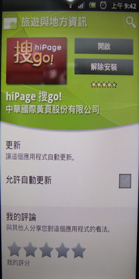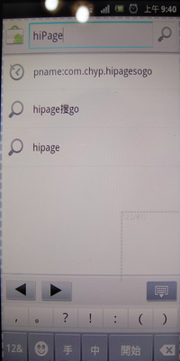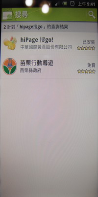 ▲第一張,從你的手機裡打開Android Market並輸入搜尋關鍵字"hipage搜go"。第二張,這時就會找到此軟體囉,就在第一個項目裡。第三張,按下後進行安裝吧,這也是免費的軟體喔。