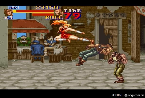 ▼超任版的『街頭快打2』偶爾會看到一些有趣的背景,有沒看到後面的麵攤誰在吃麵??