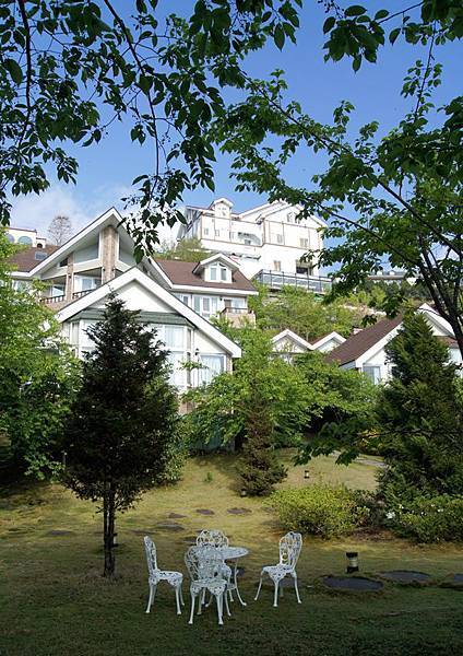 這是小鎮下方的庭院,可以將整座小鎮都收入進來相片裡面喔,這裡的樹蔭與藍天綠地,搭配著造型特殊的小鎮建築和夢幻的白色庭院桌椅,是不是很有異國度假的感覺阿