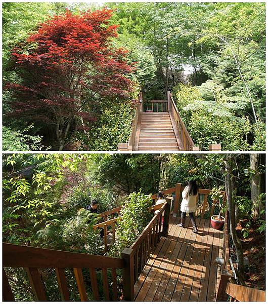 小鎮裡的植栽也是正迎合著生長的旺季,努力的吐出新芽與綠葉,隨處都可以見到綠意盎然的植物,沿著小鎮的木造階梯走下我們的房間,真的很有在森林漫步的感覺呢