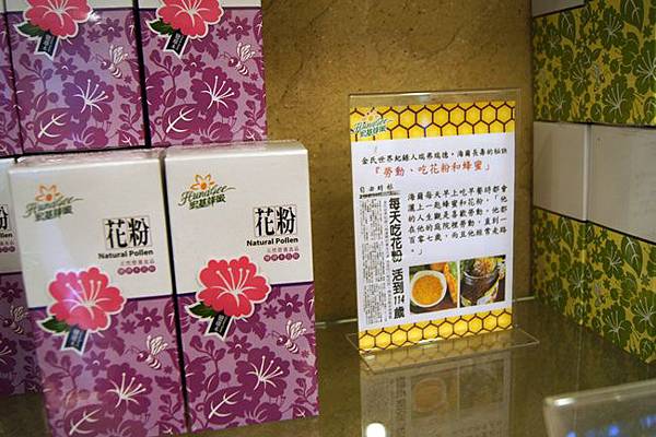 賣場裡從蜂蜜到花粉、蜂王乳、蜂膠、到蜂蜜醋、蜂蜜酒、蜂蜜果凍、蜂蜜蛋糕…等,蜂蜜產品的品項非常豐富