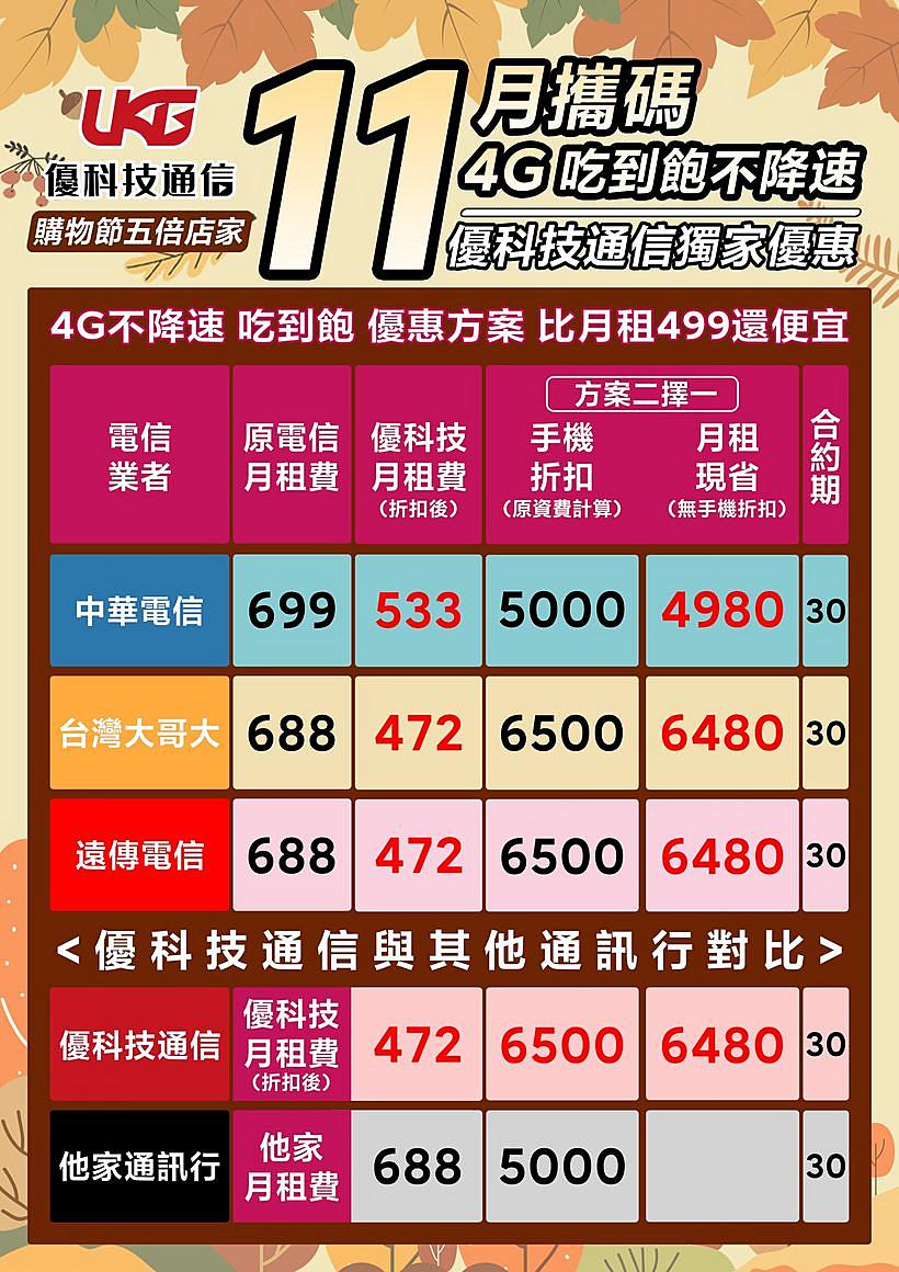 - 優科技通信月租費:472元,手機折扣:6500元