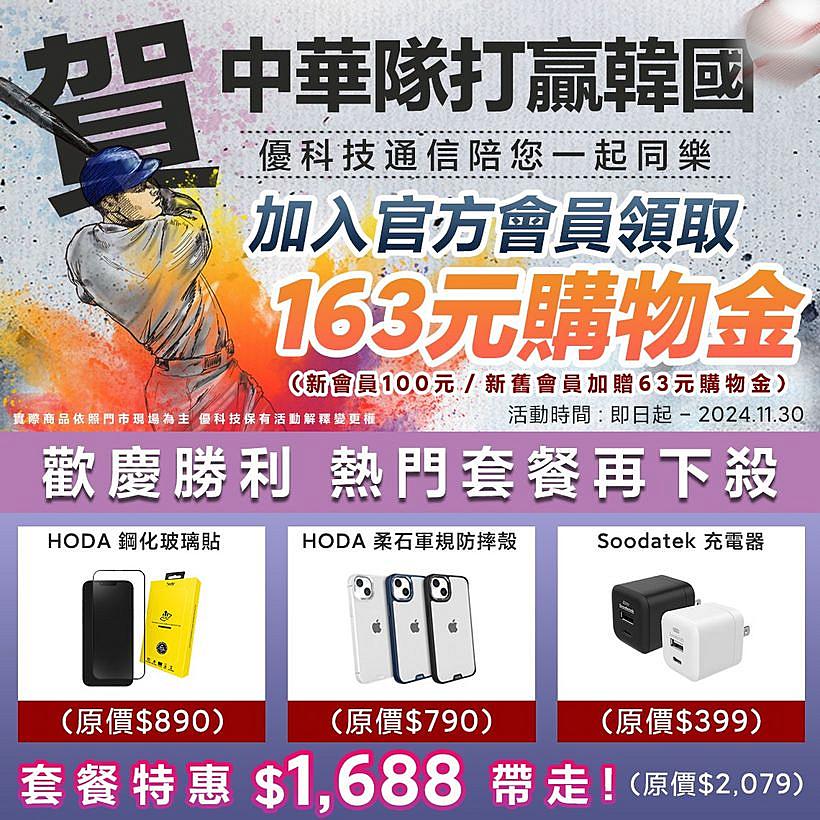 為了慶祝這場意義重大的勝利,優科技通信特別推出限時優惠活動,與您一同分享這份光榮。即日起至11月30日,只要加入我們的官方會員,即可領取「勝利購物金」163元!與您一起見證中華隊的首勝分數!