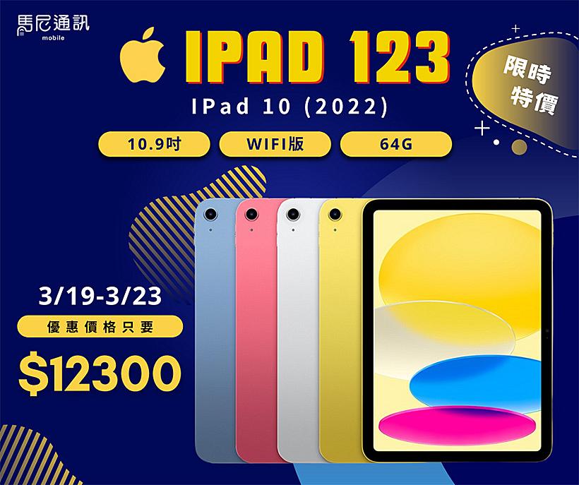 - Apple iPad 10代 (2022) 10.9吋 64GB WiFi $12,300