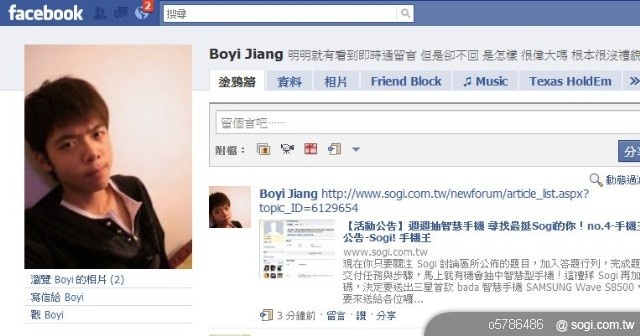 朋友 Boyi Jiang 的 Facebook 塗鴉牆證明: