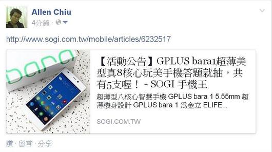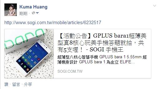 活動B:上傳分享活動圖片-- GPLUS bara 1 手機乙支(不挑色) - 2名