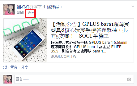 - 活動B:上傳分享活動的圖片,請先至GPLUS粉絲團(https://www.facebook.com/TheGplusFans)按讚,並將此活動網頁”公開”分享在您個人的FB塗鴉牆,再將FB的分享截圖,於本篇文章回覆留言的地方上傳,留下您FB的名稱,即可獲得第二次抽獎(須看得清楚您的名字與SOGI的活動連結網址,以及要有公開貼文的地球圖示,如範例) 。