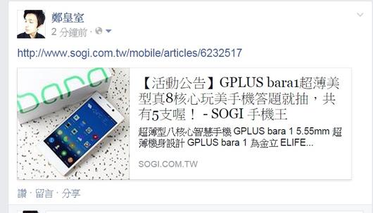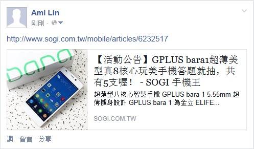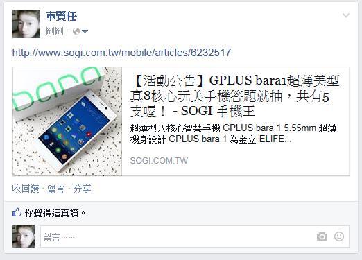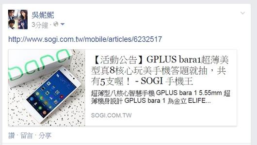 活動B:上傳分享活動圖片-- GPLUS bara 1 手機乙支(不挑色) - 2名