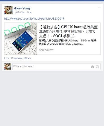 - 活動B:上傳分享活動的圖片,請先至GPLUS粉絲團(https://www.facebook.com/TheGplusFans)按讚,並將此活動網頁”公開”分享在您個人的FB塗鴉牆,再將FB的分享截圖,於本篇文章回覆留言的地方上傳,留下您FB的名稱,即可獲得第二次抽獎(須看得清楚您的名字與SOGI的活動連結網址,以及要有公開貼文的地球圖示,如範例) 。