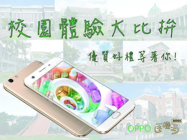 先前的 [活動]同學們站出來!介紹你的學校體驗搶拿OPPO F1s ,五位來自不同學校的同學,帶著 OPPO F1s 一起參觀了他們的校園,並且記錄下來,寫成文章與大家分享。現在要邀請大家擔任最終決選的評審,就由你來選出最喜愛的校園體驗,決定誰是最後的贏家吧!除此之外,參加評選的你,即擁有抽獎的資格,驚喜好禮等著你喔~