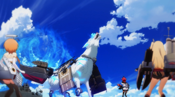 在動畫裡,海邊停泊著一艘艘的船艦,戰鬥時專屬船艦會化成大量方塊飛到她的身上變成各種裝備,有點魔法少女變身的感覺~